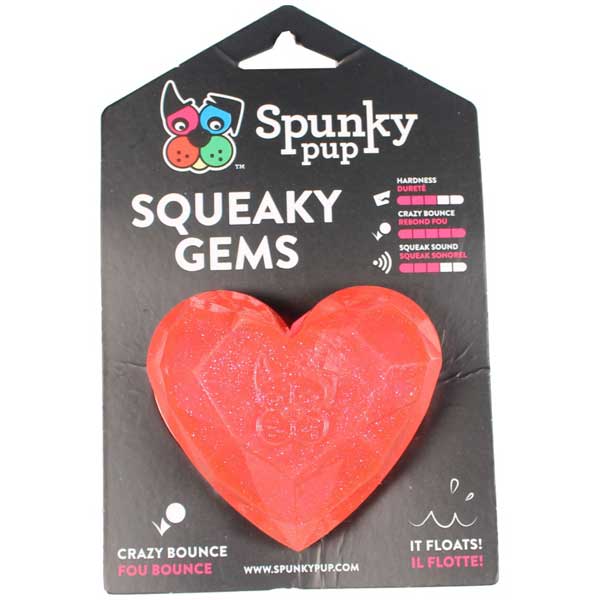 The Squeaky Gems Heart and Squeaky Gems Diamond by Spunky Pup are the fun squeaky toy shaped like a brilliant cut gem! Faceted shape for a Crazy Bounce that your dog will love. Squeaky Gems float and are dishwasher-safe. Assorted colors.