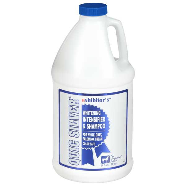 Quic Silver Shampoo, the legendary formula that continues to intensify and whiten with unrivalled performance, a professional solution for that blue-ribbon excellence. It is a gentle cleansing formula with advanced technology that creates intensifying shine for equine hair by optically altering the way light interacts with each hair shaft creating incredible platinum highlights with bold snow-white results. A low-sudsing shampoo that rinses out quickly, is an excellent stain remover and is gentle enough for everyday use. Used consistently, the optical effects intensify and enhance shine, while whitening and brightening gray and albino coats (bringing out silvery highlights); palomino and cream coats (bringing out golden highlights). Quic Silver Shampoo naturally reveals the full intensity of every color within the mane, tail and coat while providing deep-cleaning to leave your horse soft, smooth and shiny. For best results, shampoo with Quic Shampoo first to get excess dirt and debris from coat, mane and tail. Follow with Quic Silver Shampoo for a second step for color enhancement. Rinse thoroughly, and finish with Quic Conditioner concentrating on the mane and tail…and you may want to leave in a bit of conditioner to retain extra moisture.