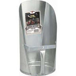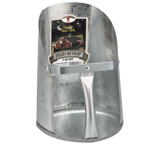 Heavy-gauge galvanized steel scoop with riveted handle. Perfect for scooping grain, but heavy-duty enough to handle pelleted hay and feeds. Flat end for easy storage. This is the scoop you want if you are looking for long wear and years of service. 7 inch long by 6.5 inch wide by 8.5 inch high, 3-quart capacity.