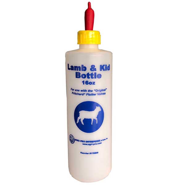 Agri-Pro Lamb and Kid Bottle with Pritchard Flutter Valve is the soft and pliable Pritchard nipple closely resembles the shape and feel of the real thing. Special flutter valve allows air to enter bottle. Screw on threads so it doesn't slip off. 16 oz plastic bottle with 1 oz graduations.