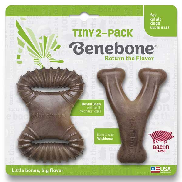 Our Tiny 2-Pack is for adult dogs under 15 pounds. Just because they’re little doesn’t mean they can’t join in on the fun. They’re as hard and durable as the rest of our chew toy line. Tiny dogs rejoice!