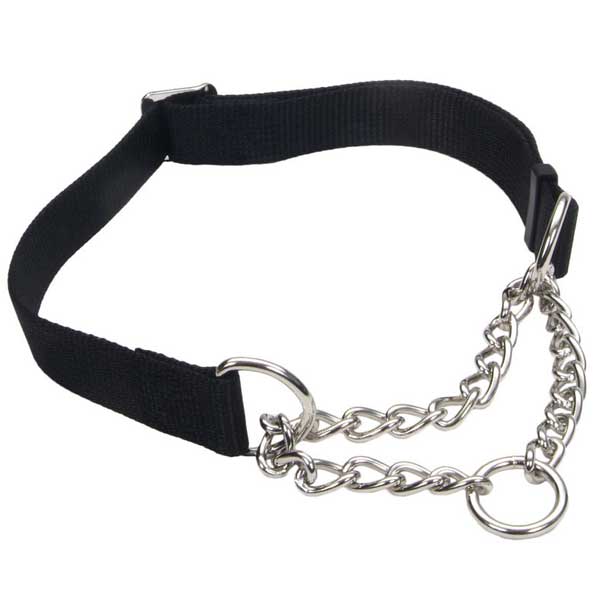 • The Adjustable Check Training Collar for Dogs has a limited-closure chain loop combined with a nylon collar.