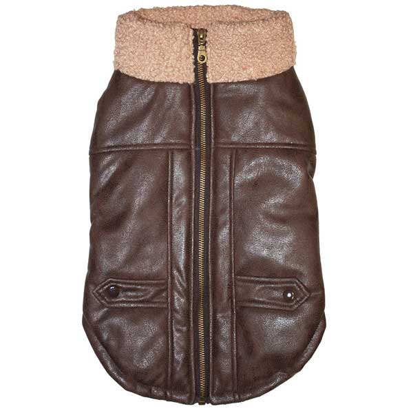 A classic returns! Brown faux leather with Sherpa trim. Functional working zipper allows access to the d ring on your dogs harness or collar. 50% PU 50% Polyester Machine wash cold with like colors. Line dry. Do not bleach.
