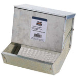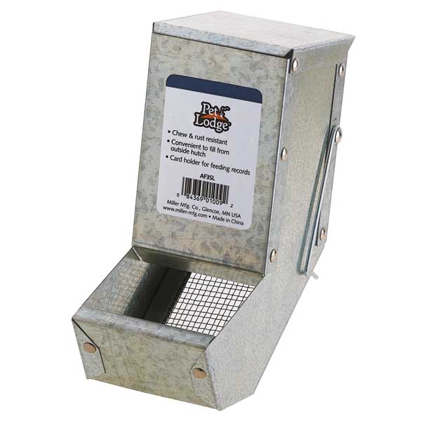 Rabbits and other small animals will not eat the fines (powdery residue) that collect in pelleted or grain feeds. If left in the feeder, these can attract harmful molds. This rabbit and small animal feeder has a wire mesh bottom that sifts fines out so they fall into the litter below. Includes independent wire hooks so the feeder can be attached to the inside of the hutch, or for more convenient filling to the outside with some wire cutting. Gravity design allows feeder to dispense several days worth of feed a little at a time. Features hinged metal lid for covering the feed. Made of chew-proof, rust-resistant, heavy-gauge galvanized steel. Measures 5.5 inch long by 3.125 inch wide by 7.125 inch high.