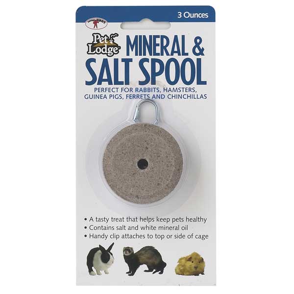 A tasty treat that provides the salt and trace minerals that small animals need to maintain good health. Formulated for rabbits, hamsters, guinea pigs, ferrets, and chinchillas. Hanger snaps to the top or side of a wire hutch to provide free-choice feeding (animals will consume only what they need). Spool is 2 inch in diameter by 1 inch thick. Metal wire hanger measures 1.5 inch wide by 2.75 inch high.