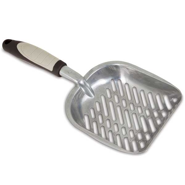 For pet parents that need a litter scoop that handles large amounts of litter clumps the Petmate Metal Litter Scoop is just what you were looking for. The slotted design scoop bowl is made from durable die-cast aluminum that will last for years. The bowl is large and edges are sharp enough to scrape off even the tough-to-remove waste which helps make cleanup easy. The two-toned, TPR handle is pliable and has an ergonomic comfortable grip for mess-free ease of use.When the scoop is soiled, simply rinse off and you are ready for the next time you need to scoop. Features a hanging hole for convenient storage. Use with all types of litter. Scoop imeasures 6 inches x 5-1/2 inches deep. Tan and brown handle.