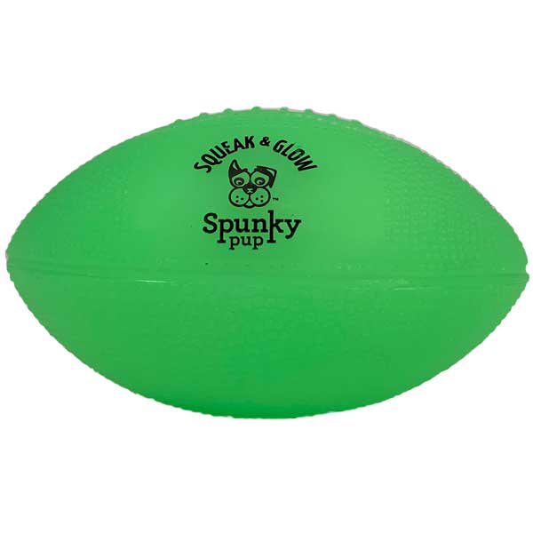 Hit the gridiron with the Squeak & Glow Football from Interactive Dog Toy! This squeaking, glow in the dark toy lets you and your dog play day or night. The durable, non-toxic glow in the Dark material and loud squeaker makes this football tons of fun. Just expose to light to see it glow in the dark. Practice your spiral with Squeak & Glow’s easy to throw, textured surface. 5 inches long.