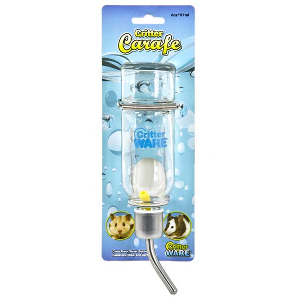 Critter Carafe is a premium quality glass bottle with a chew-proof design and drip resistant sipper. Simply secure tension spring and steel support. Can be used inside or outside a cage. Includes a floating water level indicator.