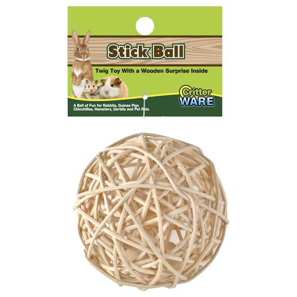 Our Stick Ball is made of 100% willow, a renewable resource, with a wood chew toy surprise inside. Chew toys encourage healthy activity and help prevent cage boredom. Pets can roll it, toss it or gnaw it.