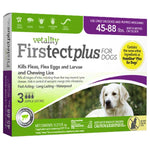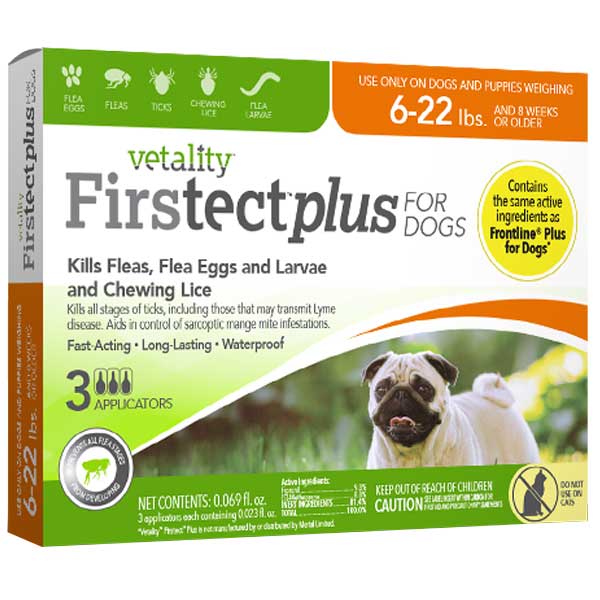 Vetality Firstect Plus for Dogs offers vet quality protection from fleas and ticks and prevents all flea stages from developing. Vetality Firstect Plus topicals eliminate fleas, flea eggs, ticks and lice. These vet-quality topicals contain the same active ingredients (fipronil + (S)-methoprene) as leading vet brand, FRONTLINE Plus for dogs but cost less.